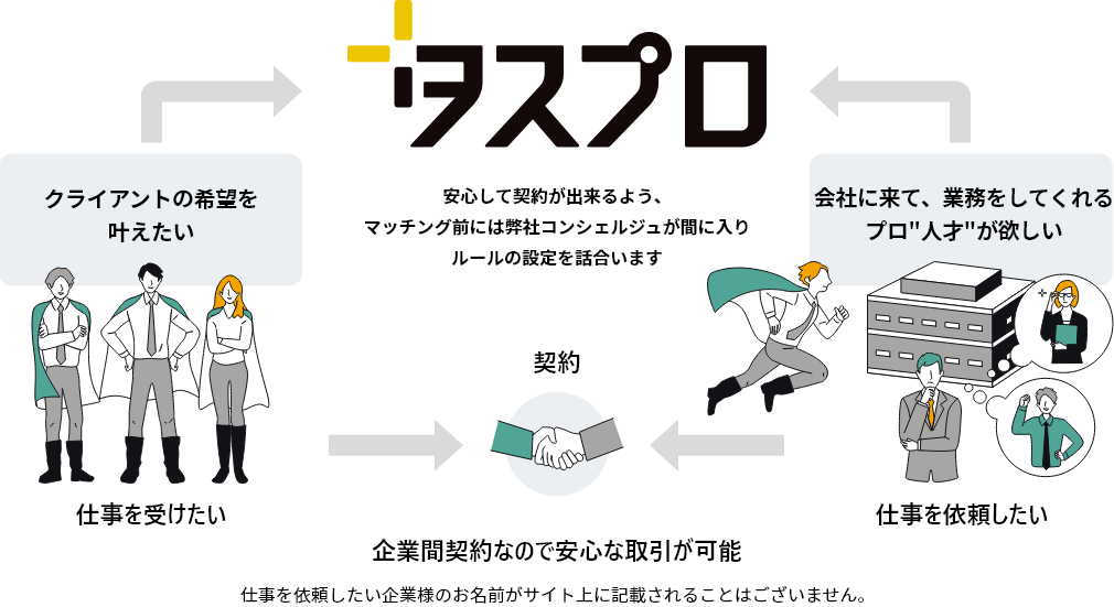 フリーランスや副業といった個人との取引ではなく、企業間での直接契約なので、安心・安全な取引が可能です。(フリーランスの方でも、法人化されている方は問題ありません。)